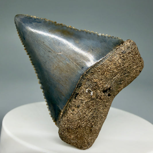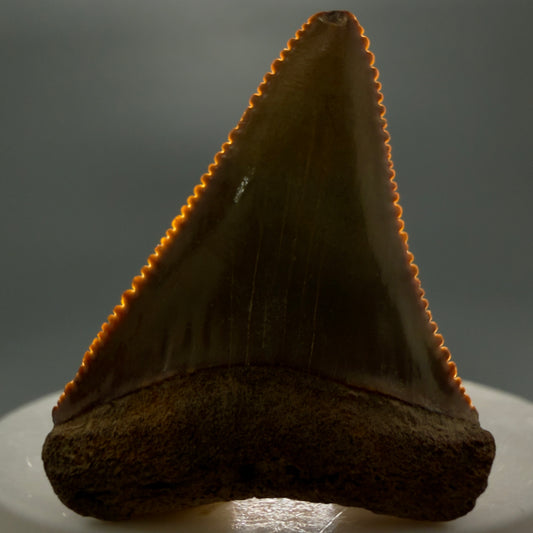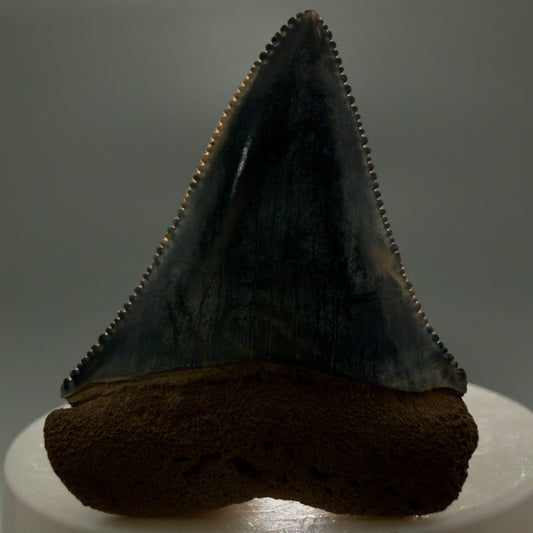 Dark colors, sharply serrated 1.35" Fossil Great White Tooth for Sale