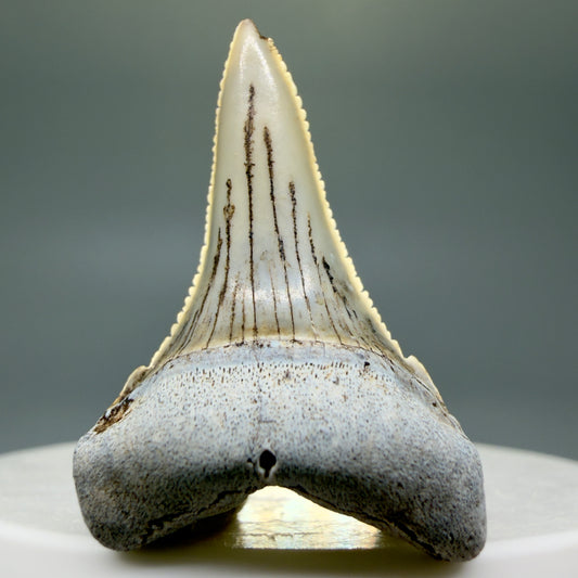Colorful, sharply serrated 1.85" Fossil Great White Tooth for Sale