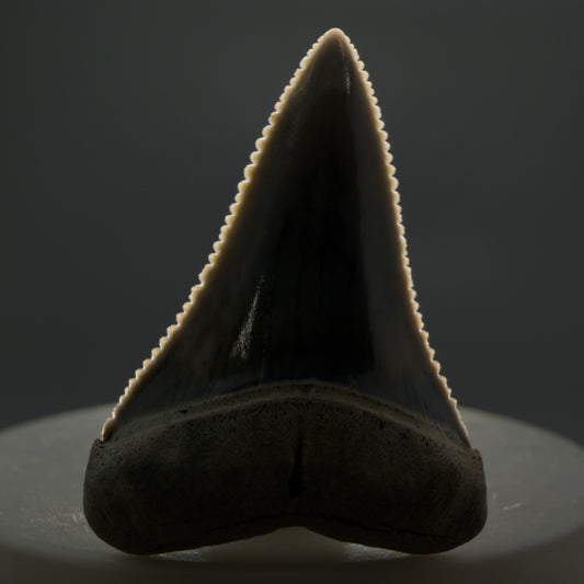 Dark Colors, sharply serrated 2.22" Fossil Great White Tooth for Sale