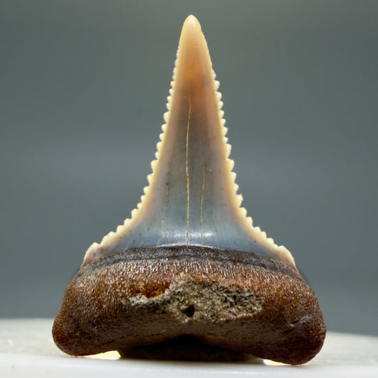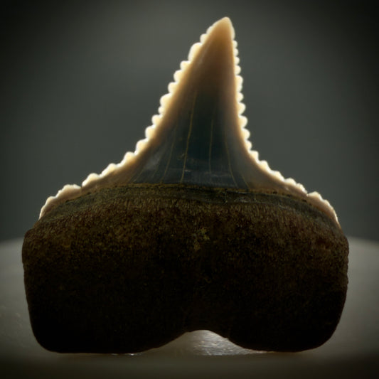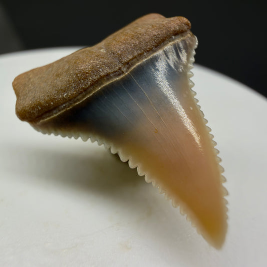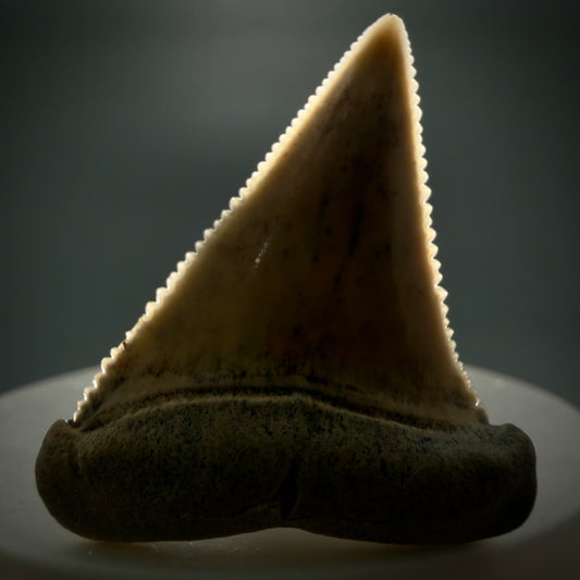 Dark Colors, sharply serrated 1.54" Fossil Great White Tooth for Sale