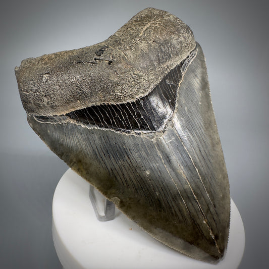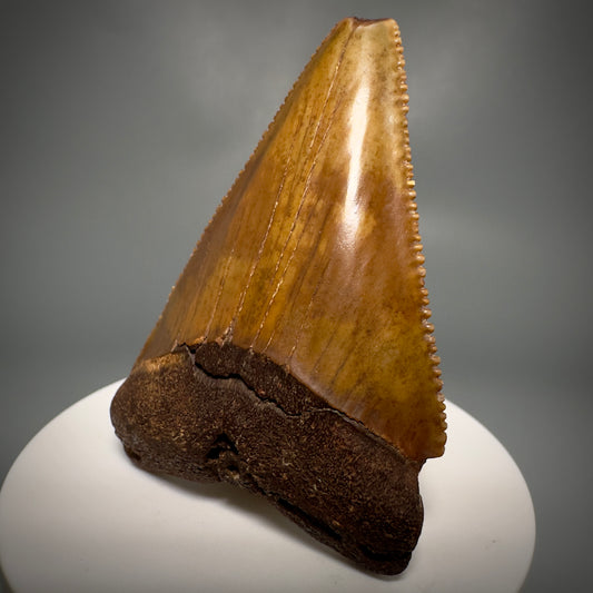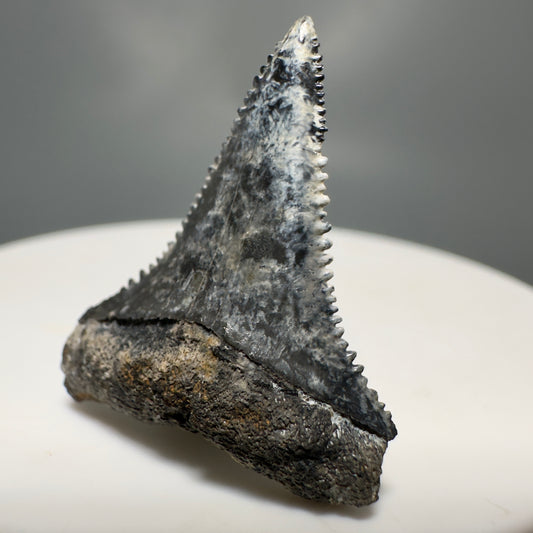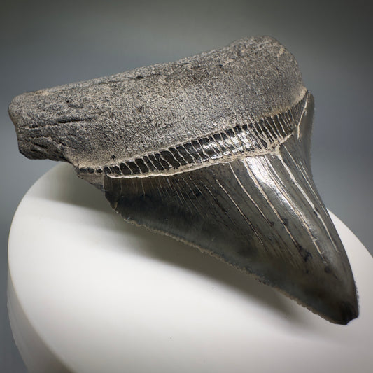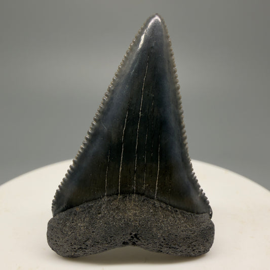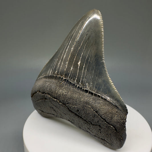Dark colors 1.64" Serrated Fossil Carcharocles angustidens Shark Tooth from South Carolina