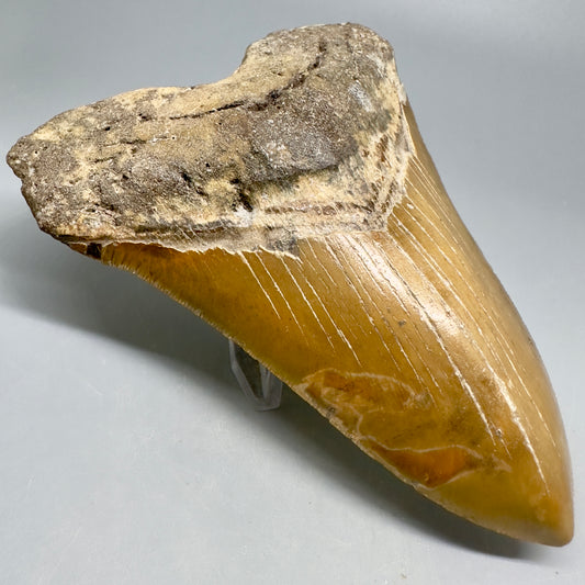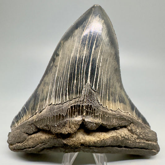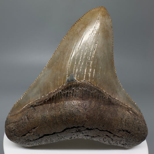 Colorful, sharply serrated 3.93" Fossil Megalodon Shark Tooth from South Carolina