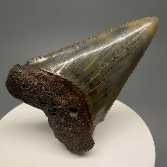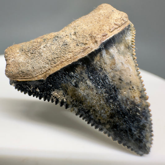 Colorful, sharply serrated 1.12" Fossil Great White Tooth from Sarasota, Florida