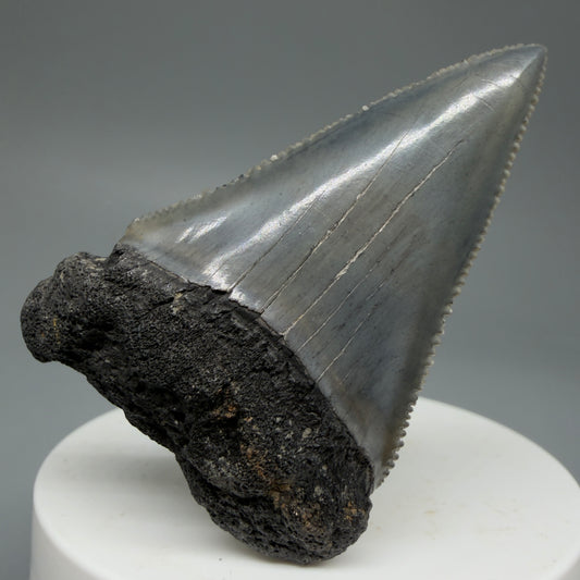 Dark Colors, sharply serrated 1.41" Fossil Great White Tooth for Sale