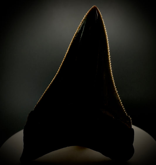 Dark colors 1.64" Serrated Fossil Carcharocles angustidens Shark Tooth from South Carolina