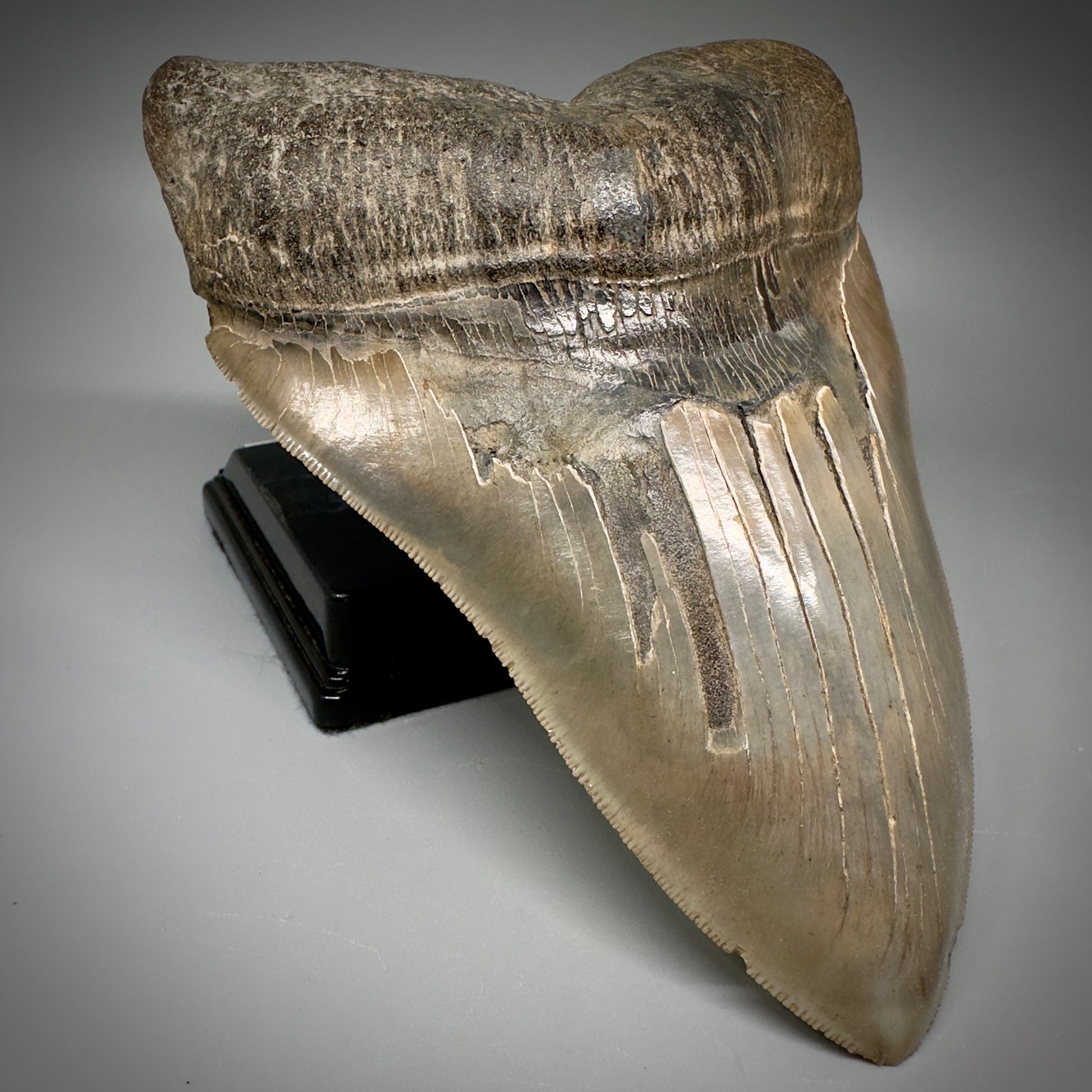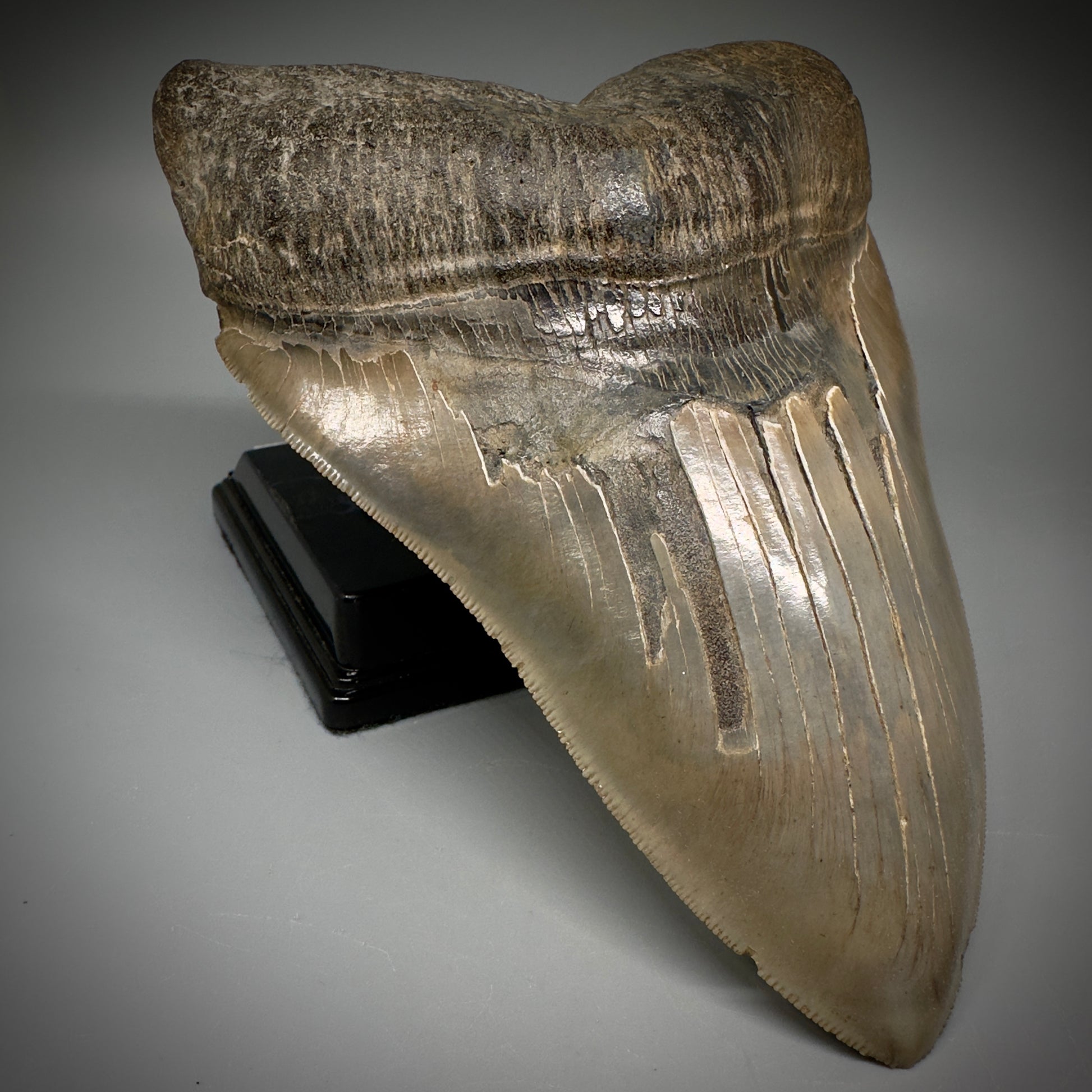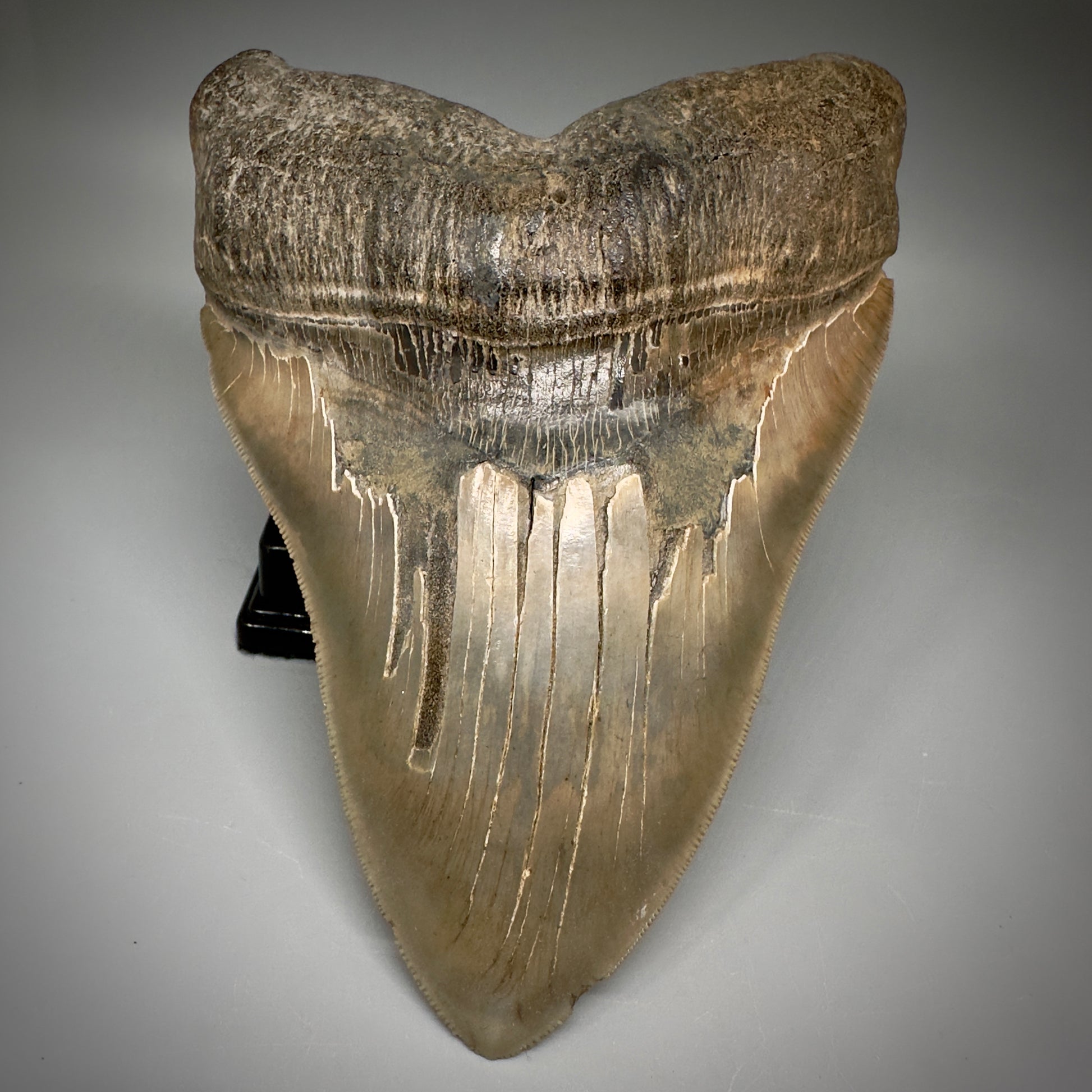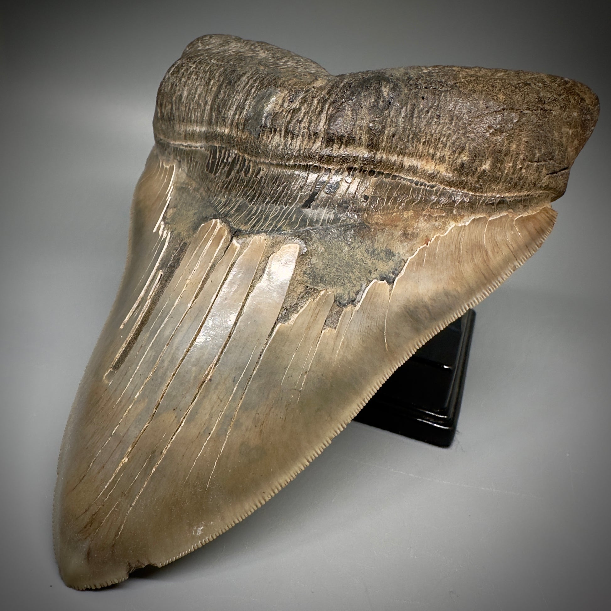 Remarks - This absolute monster of a megalodon measures a staggering 6.78 inches - just shy of its maximum size of a little over 7"! Teeth this size are found maybe once or twice during the CAREER of an avid diver with many thousands of blackwater dives. And that was years ago - today the odds are less than half that. This massive tooth was found approximately 30 years ago and has been tucked away deep inside a private collection until now. This massive specimen has razor-sharply serrated edges, beautiful tan/gray coloration, and is an incredibly solid and heavy tooth weighing more than 1.25lbs (610 grams)!!!