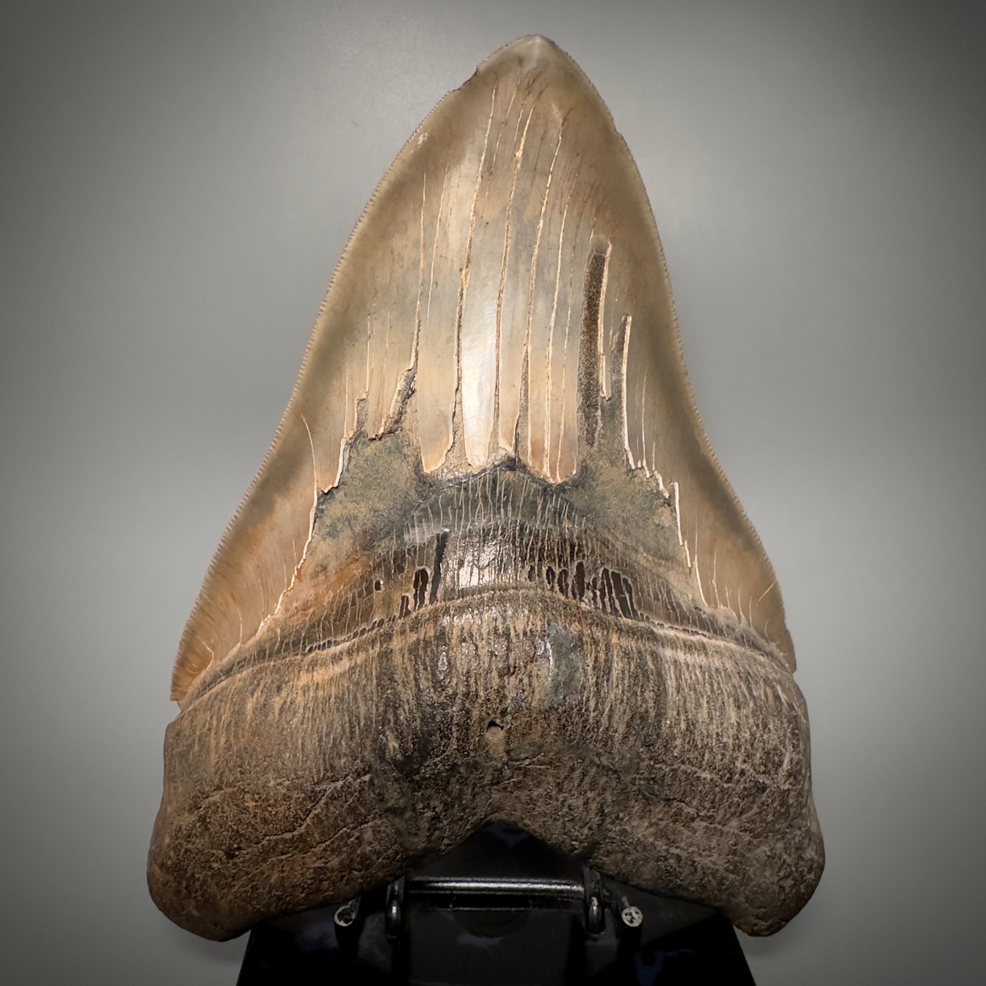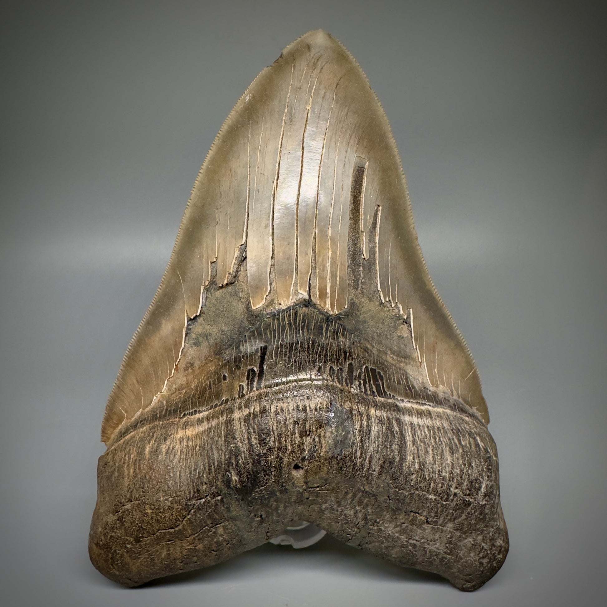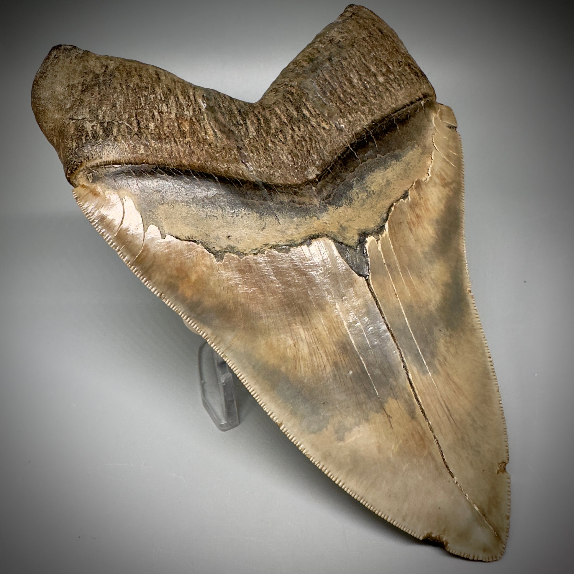 Remarks - This absolute monster of a megalodon measures a staggering 6.78 inches - just shy of its maximum size of a little over 7"! Teeth this size are found maybe once or twice during the CAREER of an avid diver with many thousands of blackwater dives. And that was years ago - today the odds are less than half that. This massive tooth was found approximately 30 years ago and has been tucked away deep inside a private collection until now. This massive specimen has razor-sharply serrated edges, beautiful tan/gray coloration, and is an incredibly solid and heavy tooth weighing more than 1.25lbs (610 grams)!!!