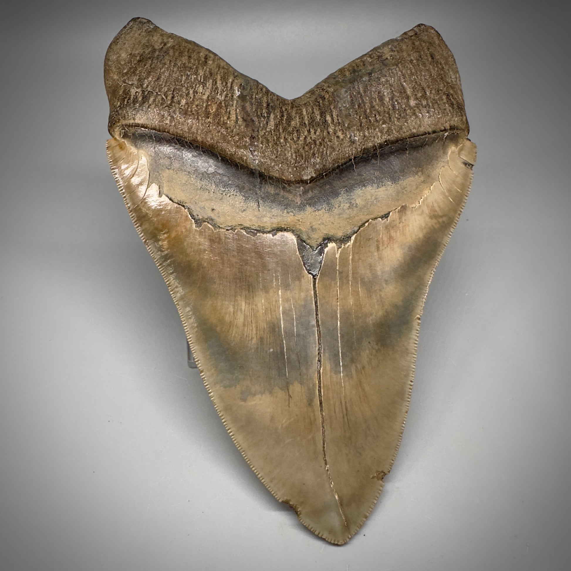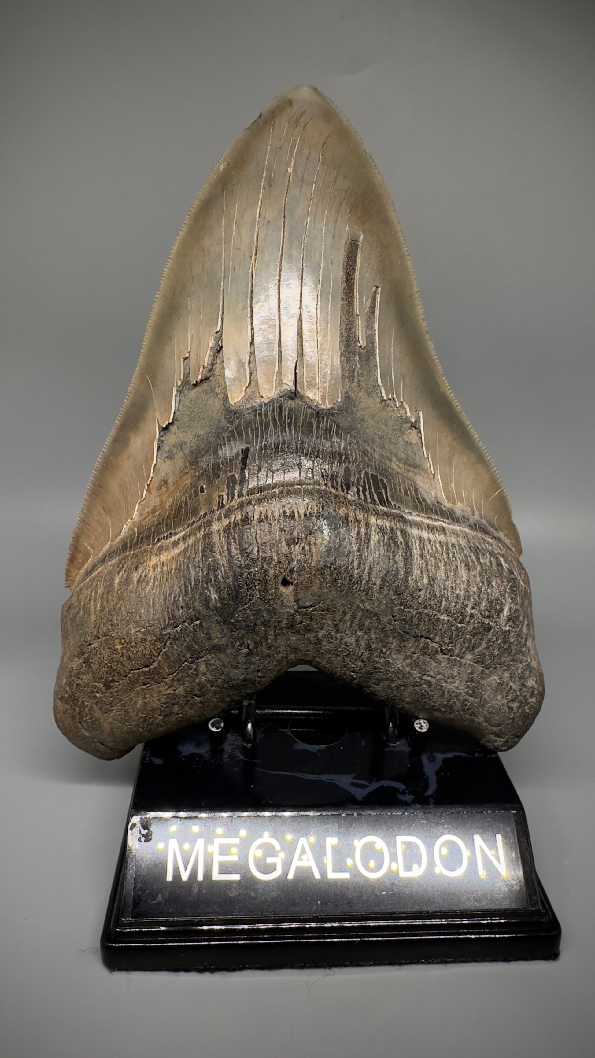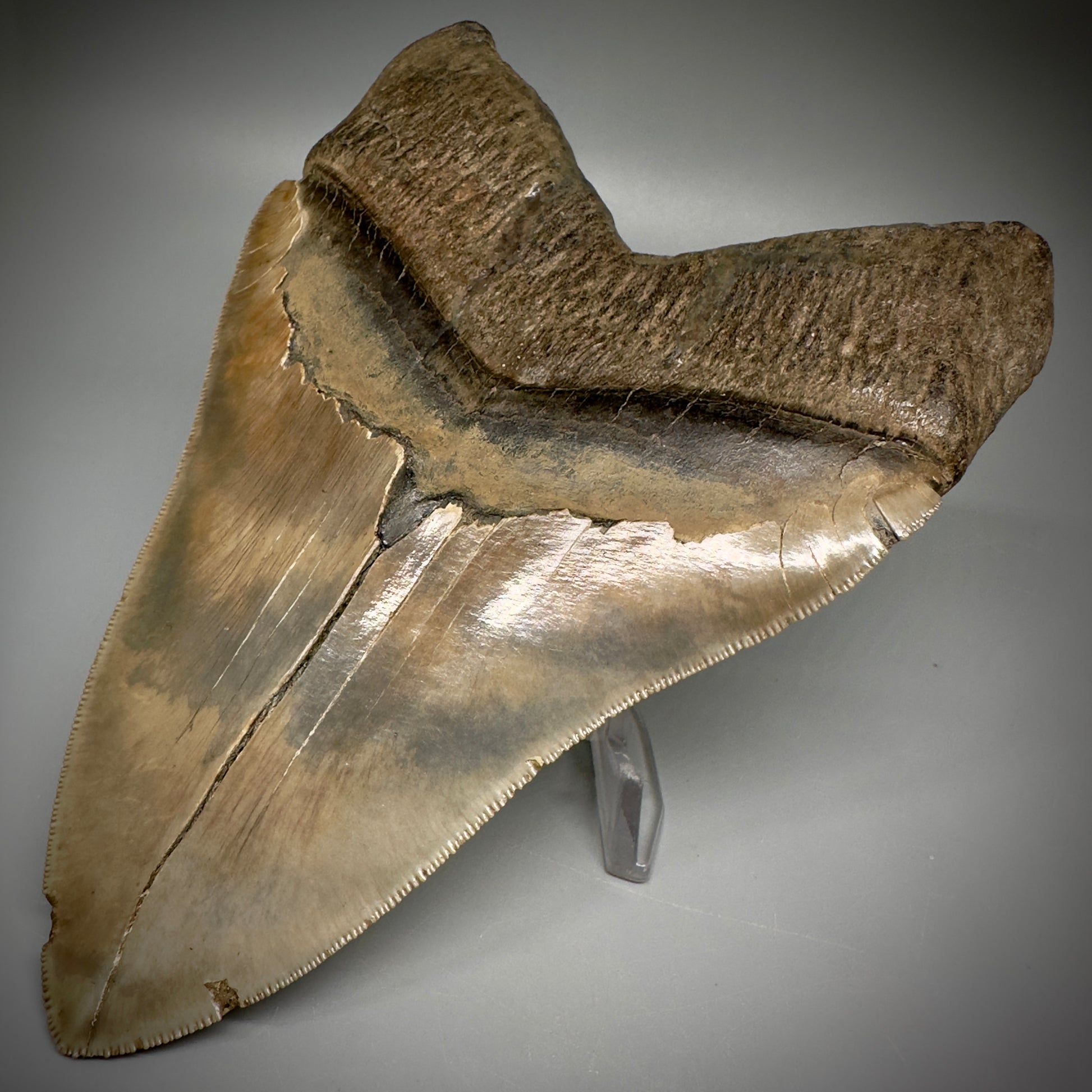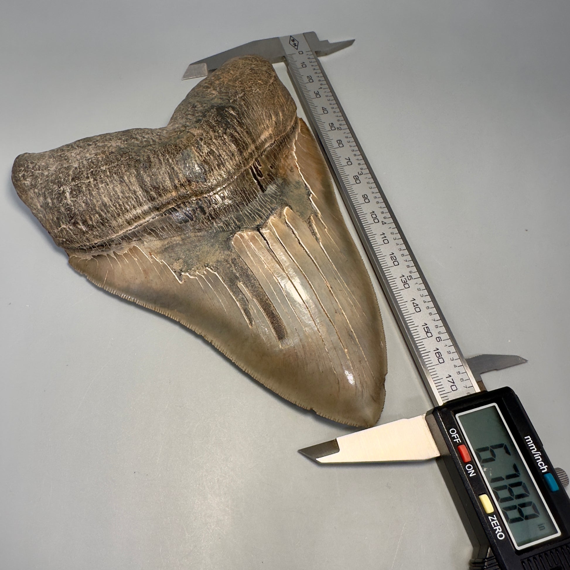 Remarks - This absolute monster of a megalodon measures a staggering 6.78 inches - just shy of its maximum size of a little over 7"! Teeth this size are found maybe once or twice during the CAREER of an avid diver with many thousands of blackwater dives. And that was years ago - today the odds are less than half that. This massive tooth was found approximately 30 years ago and has been tucked away deep inside a private collection until now. This massive specimen has razor-sharply serrated edges, beautiful tan/gray coloration, and is an incredibly solid and heavy tooth weighing more than 1.25lbs (610 grams)!!!
