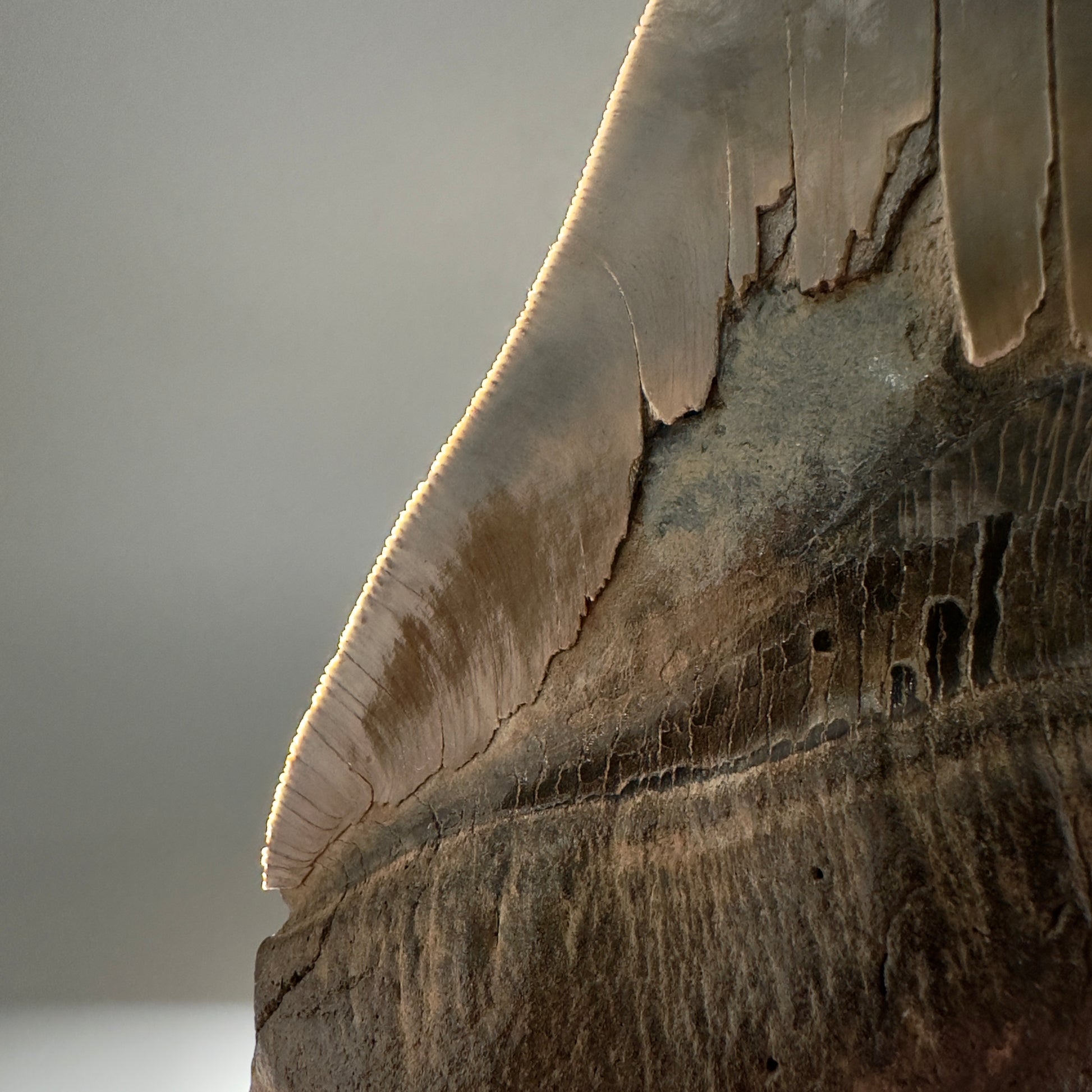Almost all teeth we sell will be free of repair or restoration and if there is any it will be clearly labeled and described. This tooth DOES HAVE EXTREMELY MINIMAL RESTORATION WORK DONE TO THE ROOT. This consists merely of filling in a couple small cracks in the center of the root, the bottom edge of the bourlette right above the enamel, and on the flat side (front) of the tooth just where the enamel meets the root. It was done a long time ago we suspect to add to the stability and overall aesthetics. In any case the work really is minor and this tooth is a good 98% natural with only 2% restoration. The enamel, serrations, root lobes, etc. are all totally natural and untouched and the size of this enormous monster is 100% natural and amazing.
