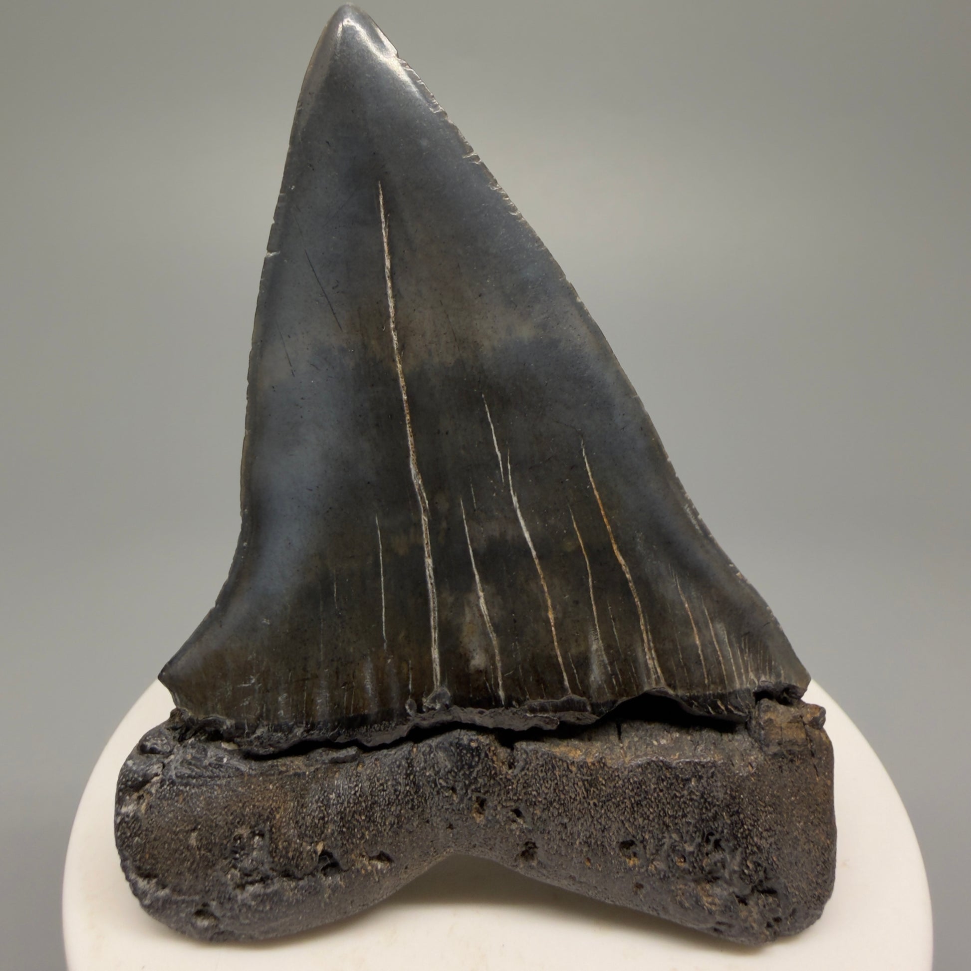 Factors in the value of fossilized Extinct Mako Shark teeth are numerous. Rarer localities can command a premium but the most important factors in the value of Extinct Mako Shark teeth is the overall quality and size. Larger teeth over 2.5" are much less commonly found than the smaller teeth in the 1"-1.5" size range and are obviously worth more money. Teeth that reach the magic 3" mark are valued exponentially more as they are rarely seen on the market. Extinct Mako Shark teeth found in perfect condition have razor-sharp edges (these are not serrated but more like a razor), complete root, and enamel. To find a tooth of this quality after 4-15 million years is substantially rarer than finding one that has been exposed to water currents or sand/wind erosion and suffered wear or damage. The vast majority of fossilized Extinct Mako Shark teeth offered for sale will have minimal wear or damage after such a long time waiting to be discovered! So when a tooth is found that is in near pristine condition the value is incrementally more than the normal worn or damaged tooth. Colors or different color patterns can also play an important factor in the value. Extinct Mako Shark teeth can be found in just about every possible hue with the most typically seen being different shades of gray or tan. Any other colors can be quite exotic and more valuable.